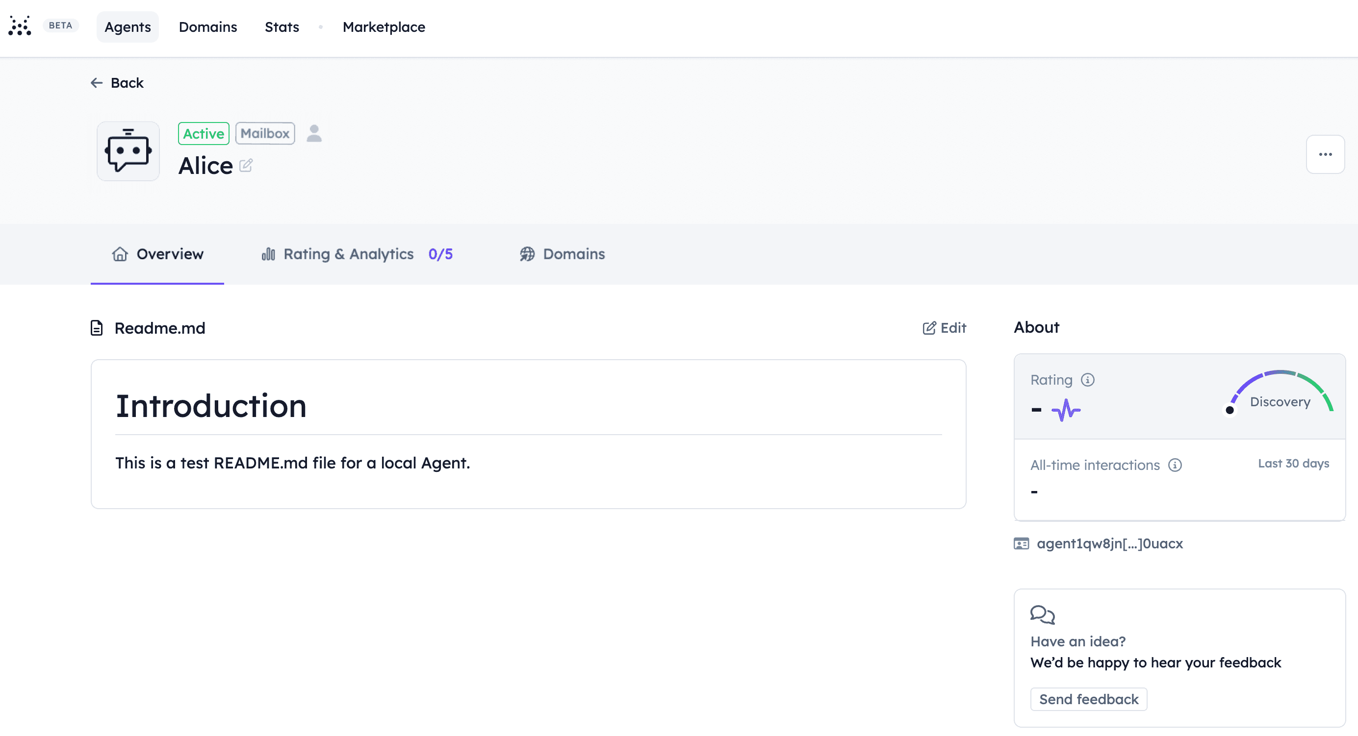 Cool! You have correctly set up a mailbox for the Agent. You can additionally add some further details to the local Agent such as the README.md file. To do so, create a file in your local Agent folder and name it README.md (You can instead provide the path towards it if you wish). In the file, add all the needed details and save it. Then, add the following bits to your local Agent code: