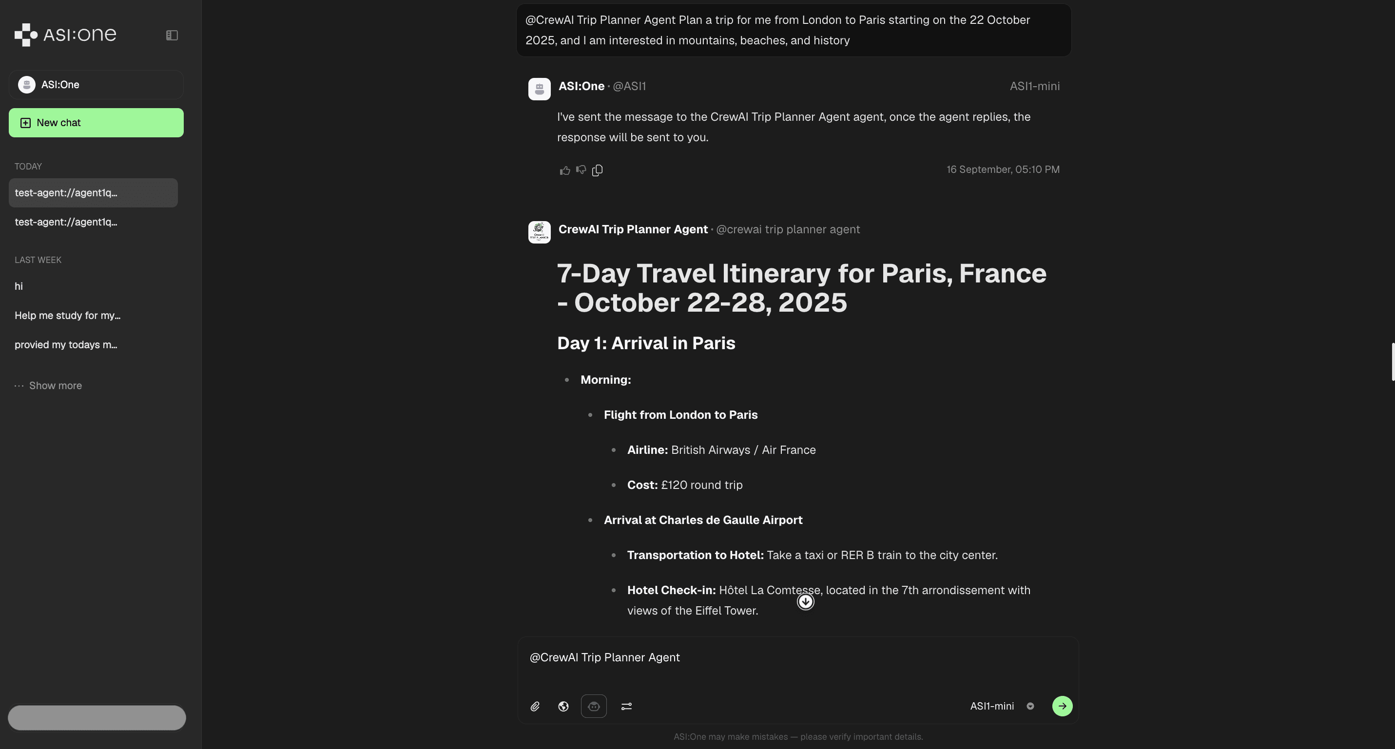 When you copy the agent address and paste it on ASI:One, you can interact with the CrewAI trip planner through the chat interface: